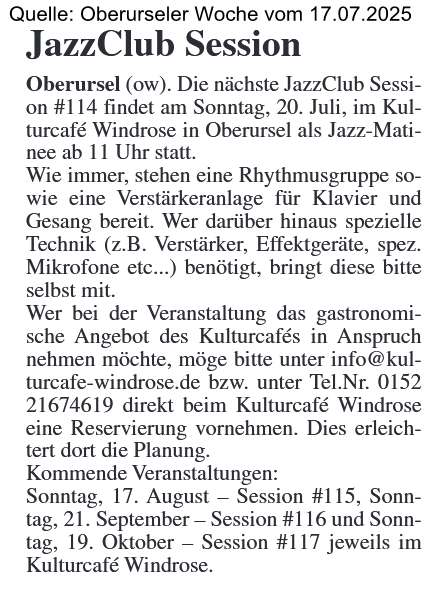 Die JazzClub-Session Oberursel ist seit über einem Jahrzehnt eine sehr erfolgreiche Größe in der Kulturszene Rhein-Main. Gegründet wurde sie in 2010 als 'Friday Night JamSession JaZZ' durch Mario + Marc, die die Session bis Anfang 2012 mit unermüdlichem Einsatz organisiert und geleitet haben. Dafür an dieser Stelle ein ganz herzliches Dankeschön !